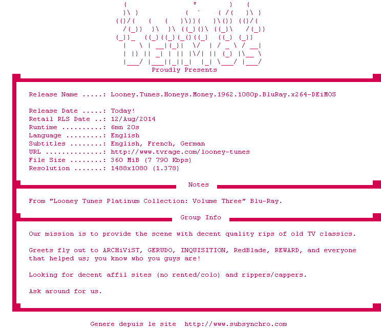 Voir le nfo de la release Looney.Tunes.Honeys.Money.1962.1080p.BluRay.x264-DEiMOS