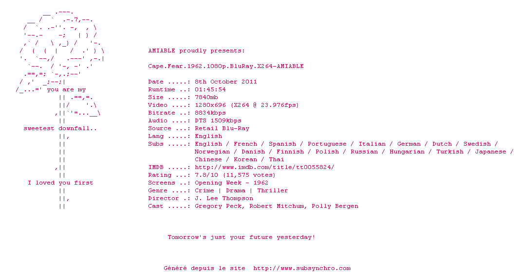 | Voir le nfo de la release Cape.Fear.1962.720p.BluRay.X264-AMIABLE | AMIABLE | Cape.Fear.1962.720p.BluRay.X264-AMIABLE OpenSubtitles | 0 fichier | ||