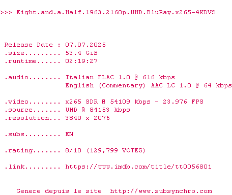 Voir le nfo de la release Eight.And.A.Half.1963.2160p.UHD.BluRay.H265-WOU