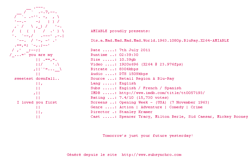 Voir le nfo de la release Its.A.Mad.Mad.Mad.Mad.World.1963.1080p.BluRay.x264-AMIABLE