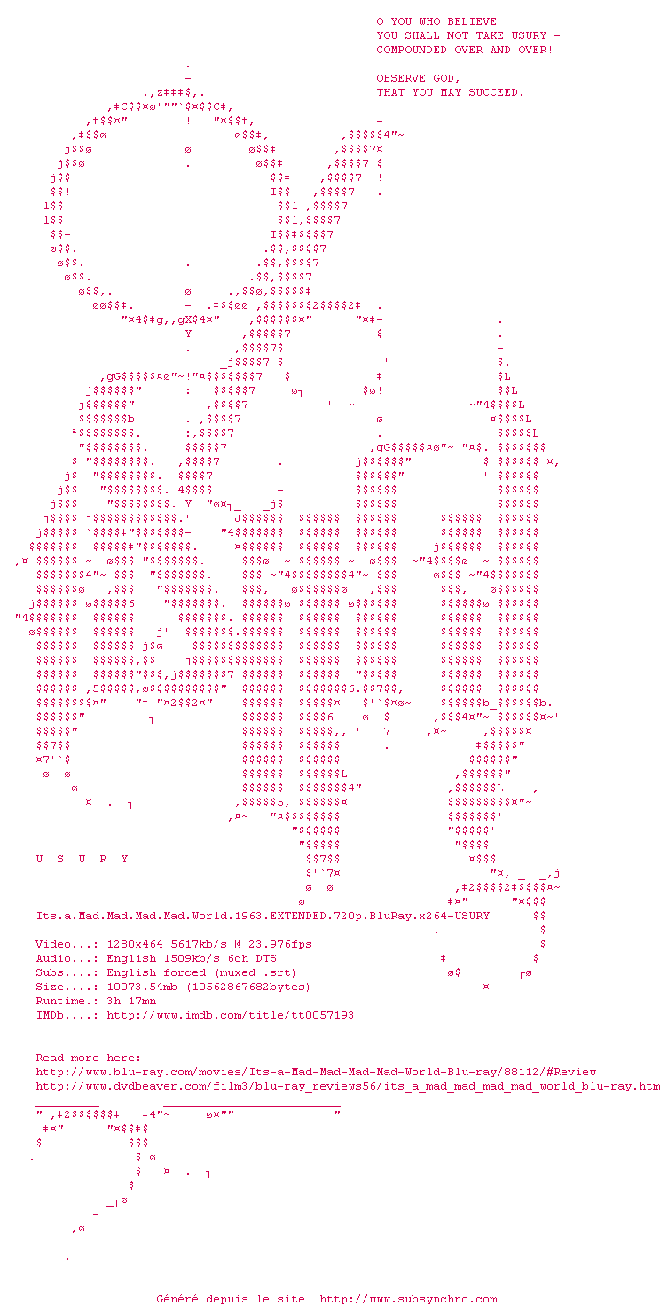 Voir le nfo de la release Its.A.Mad.Mad.Mad.Mad.World.1963.EXTENDED.1080p.BluRay.x264-USURY