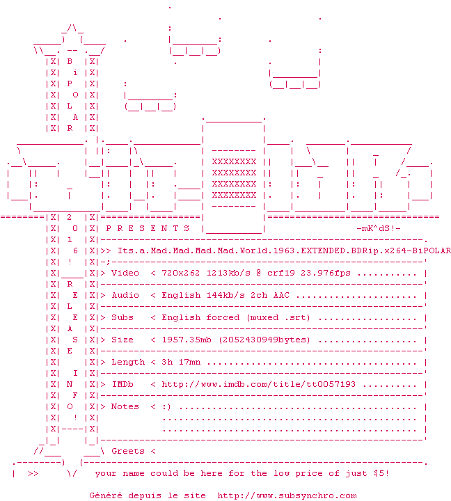 Voir le nfo de la release Its.A.Mad.Mad.Mad.Mad.World.1963.EXTENDED.BDRip.x264-BiPOLAR