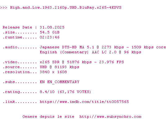 Voir le nfo de la release High.And.Low.1963.2160p.UHD.BluRay.x265-4KDVS