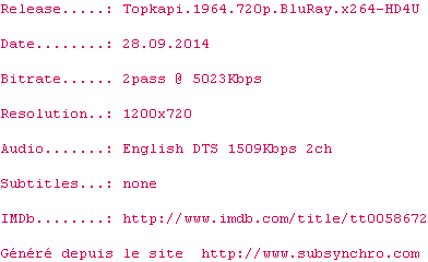 | Voir le nfo de la release Topkapi.1964.720p.BluRay.x264-HD4U | HD4U | Topkapi.1964.720p.BluRay.x264-HD4U OpenSubtitles | 0 fichier |