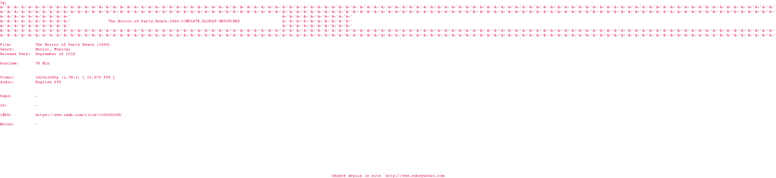 | Voir le nfo de la release The.Horror.Of.Party.Beach.1964.COMPLETE.BLURAY-UNTOUCHED | UNTOUCHED | The.Horror.Of.Party.Beach.1964.COMPLETE.BLURAY-UNTOUCHED OpenSubtitles | 0 fichier | ||