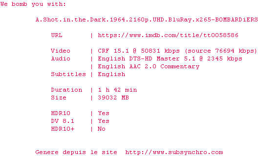 La release A.Shot.In.The.Dark.1964.2160p.UHD.BluRay.x265-B0MBARDiERS est en 4K