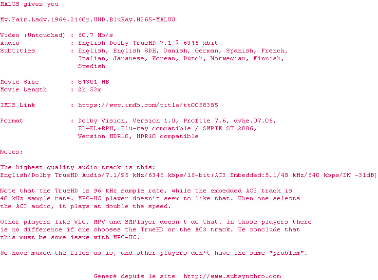 | Voir le nfo de la release My.Fair.Lady.1964.2160p.UHD.BluRay.H265-MALUS | MALUS | My.Fair.Lady.1964.2160p.UHD.BluRay.H265-MALUS OpenSubtitles La release My.Fair.Lady.1964.2160p.UHD.BluRay.H265-MALUS est en 4K | 0 fichier |