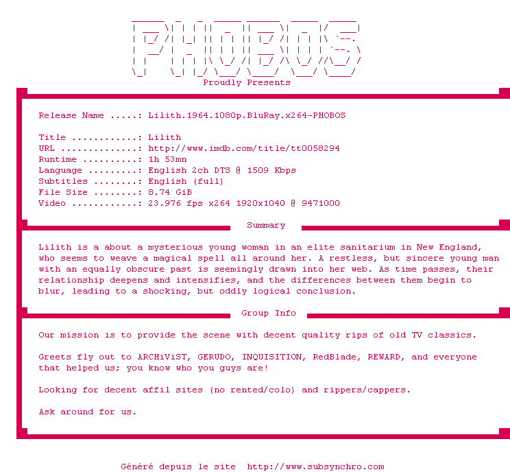 | Voir le nfo de la release Lilith.1964.1080p.BluRay.x264-PHOBOS | PHOBOS | Lilith.1964.1080p.BluRay.x264-PHOBOS OpenSubtitles | 0 fichier | ||