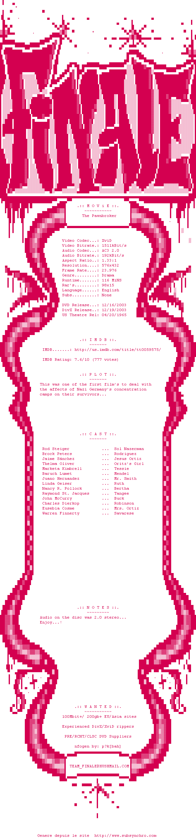 Voir le nfo de la release The.Pawnbroker.1964.DVDRip.XviD-FiNaLe