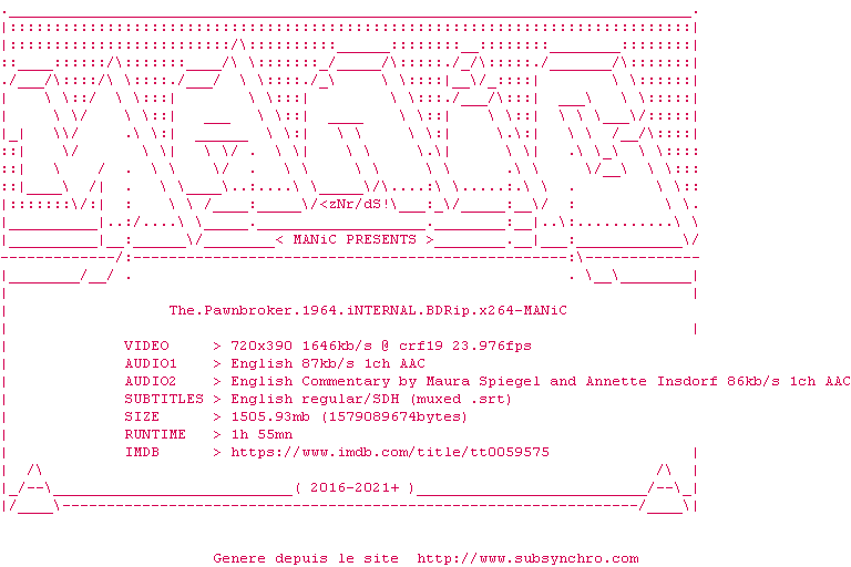 Voir le nfo de la release The.Pawnbroker.1964.iNTERNAL.BDRip.x264-MANiC
