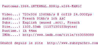 | FHD | Fantomas.1964.FRENCH.1080p.BluRay.x264-FHD OpenSubtitles | 0 fichier | |||