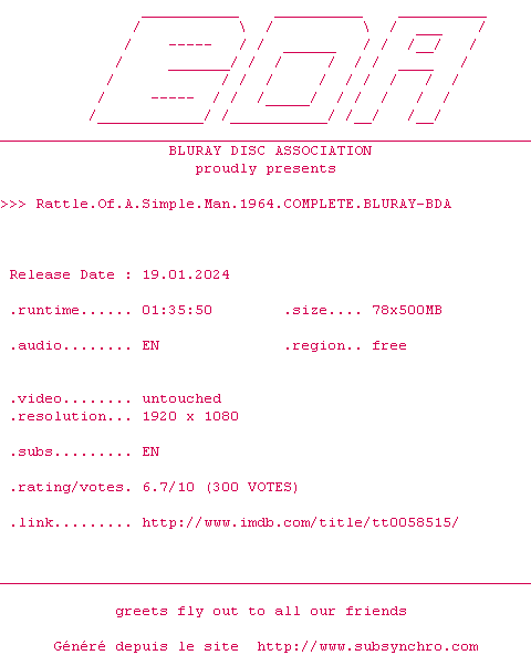 Telechargez le RSS « Fichier de la release Rattle.Of.A.Simple.Man.1964.COMPLETE.BLURAY-BDA »