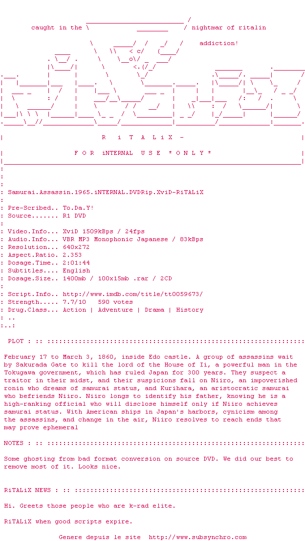 Y avez-vous pense ? Nous proposons déjà 1 sous-titre pour le film Samouraï. Avez-vous essaye de voir si ces sous-titres etaient compatibles avec cette release ? On vous laisse le soin de tester cela pour nous et de contribuer au site en postant le sous-titre en cas de compatiblite constatee !
