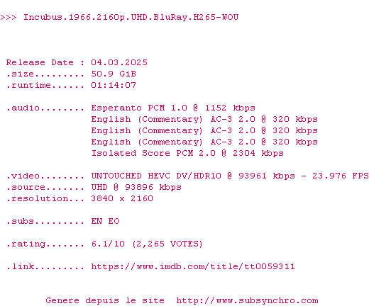 Voir le nfo de la release Incubus.1966.2160p.UHD.BluRay.H265-WOU