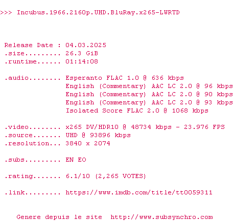 Voir le nfo de la release Incubus.1966.2160p.UHD.BluRay.x265-LWRTD