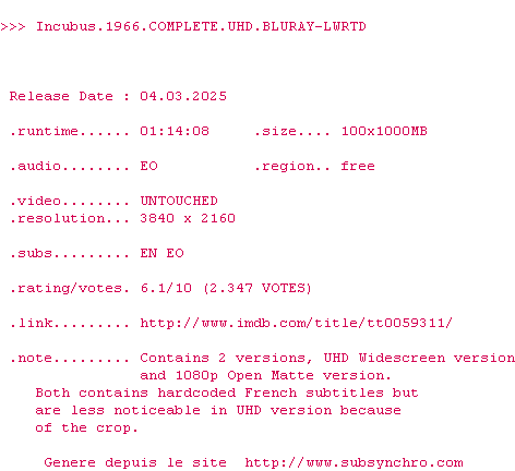La release Incubus.1966.COMPLETE.UHD.BLURAY-LWRTD est en 4K