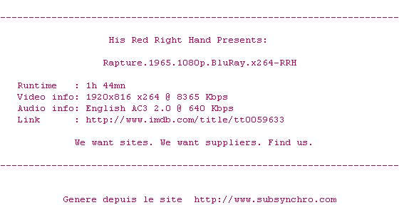 Y avez-vous pense ? Nous proposons déjà 1 sous-titre pour le film La fleur de l'âge. Avez-vous essaye de voir si ces sous-titres etaient compatibles avec cette release ? On vous laisse le soin de tester cela pour nous et de contribuer au site en postant le sous-titre en cas de compatiblite constatee !