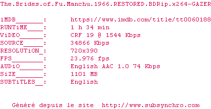 | GAZER | The.Brides.Of.Fu.Manchu.1966.1080p.BluRay.x264-GAZER OpenSubtitles | 0 fichier | |||