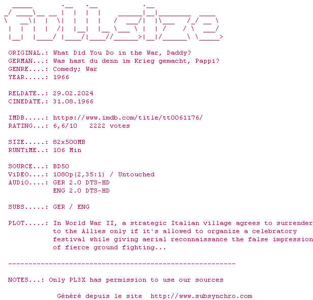 Voir le nfo de la release What.Did.You.Do.In.The.War.Daddy.1966.DUAL.COMPLETE.BLURAY-FULLSiZE