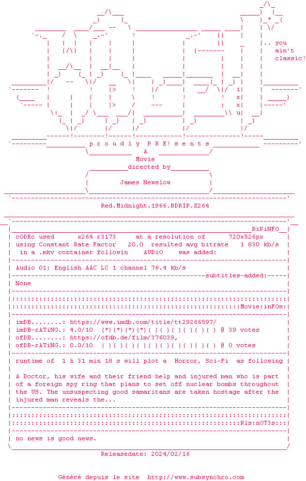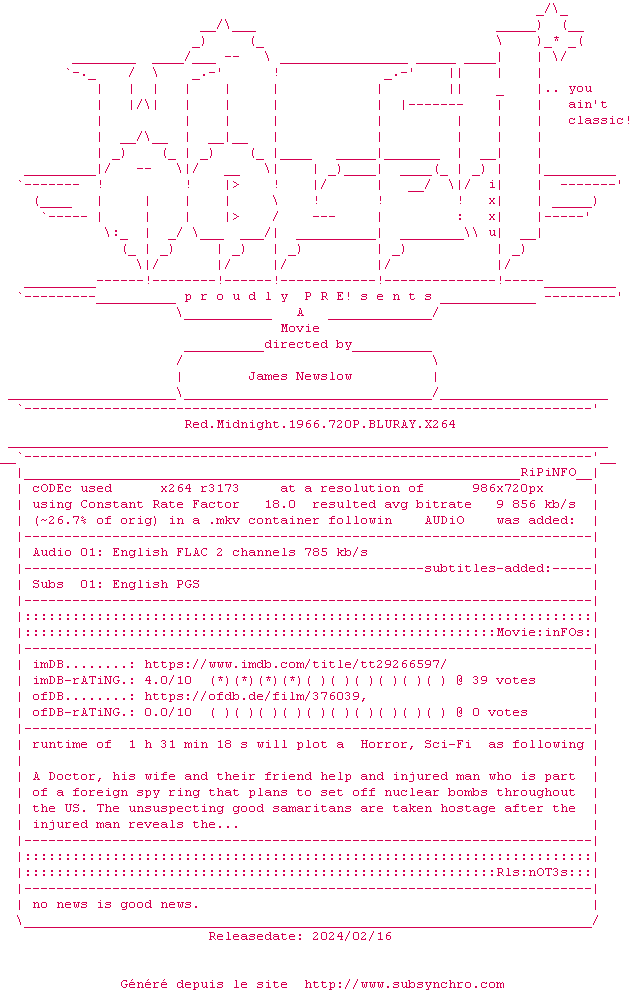 Voir le nfo de la release Red.Midnight.1966.1080P.BLURAY.H264-UNDERTAKERS