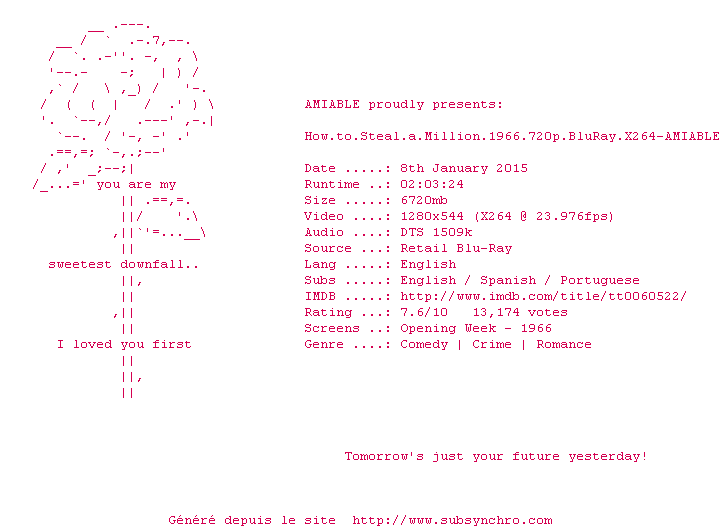 Voir le nfo de la release How.to.Steal.a.Million.1966.720p.BluRay.X264-AMIABLE