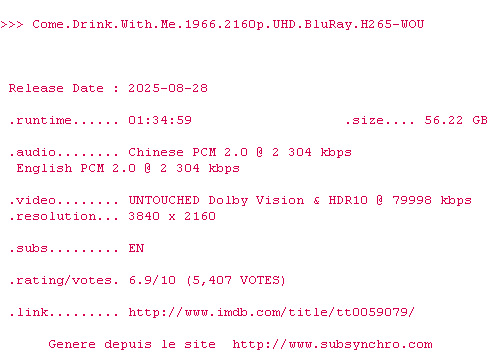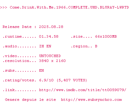 Voir le nfo de la release Come.Drink.With.Me.1966.COMPLETE.UHD.BLURAY-LWRTD