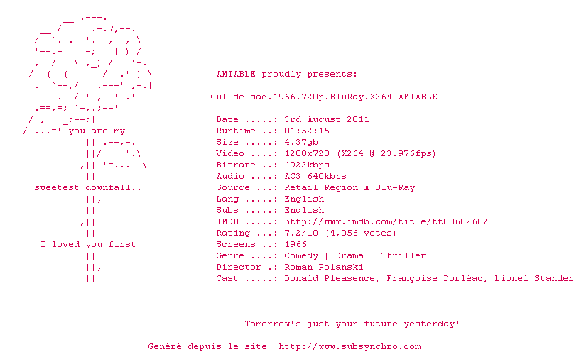 Cul-de-sac.1966.720p.BluRay.X264-AMIABLE.fre.srt Ajouté par Spaceboy74 Ajoute le 03-09-2011 13:11:28 Format : SRT Italique : Non Taille : 0.00Ko Telechargement : 176 Criterion Collection Ajouter cette release à ma collection en cas de telechargement des sous-titres 0 0 0 Telecharger le ZiP contenant NFO, Affiche, Sous-titre (*.srt) Commentez le fichier Cul-de-sac.1966.720p.BluRay.X264-AMIABLE.fre.srt Commentez le fichier Cul-de-sac.1966.720p.BluRay.X264-AMIABLE.fre.srt Commentez ce fichier Le fichier 83-1315048326.srt n'existe pas ! Telechargez le RSS « Fichier de la release Cul-de-sac.1966.720p.BluRay.X264-AMIABLE » Retour au film « Cul-de-sac »