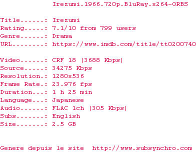 Y avez-vous pense ? Nous proposons déjà 2 sous-titres pour le film Tatouage. Avez-vous essaye de voir si ces sous-titres etaient compatibles avec cette release ? On vous laisse le soin de tester cela pour nous et de contribuer au site en postant le sous-titre en cas de compatiblite constatee !