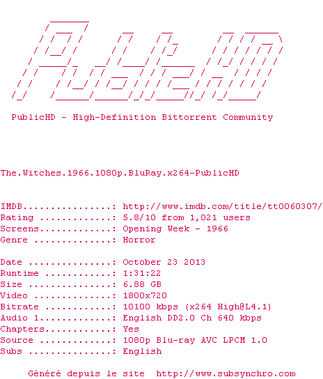 Telechargez le RSS « Fichier de la release The.Witches.1966.1080p.BluRay.x264-PublicHD »