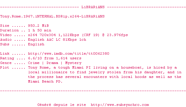 Voir le nfo de la release Tony.Rome.1967.iNTERNAL.BDRip.x264-LiBRARiANS