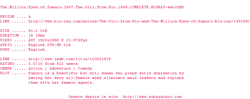 Sumuru, une femme fatale mégalomane, tente de dominer le monde en éliminant les dirigeants masculins et en les remplaçant par ses agents féminins sexy.