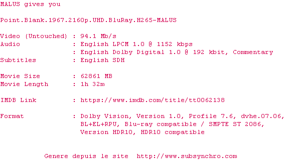 La release Point.Blank.1967.2160p.UHD.BluRay.H265-MALUS est en 4K