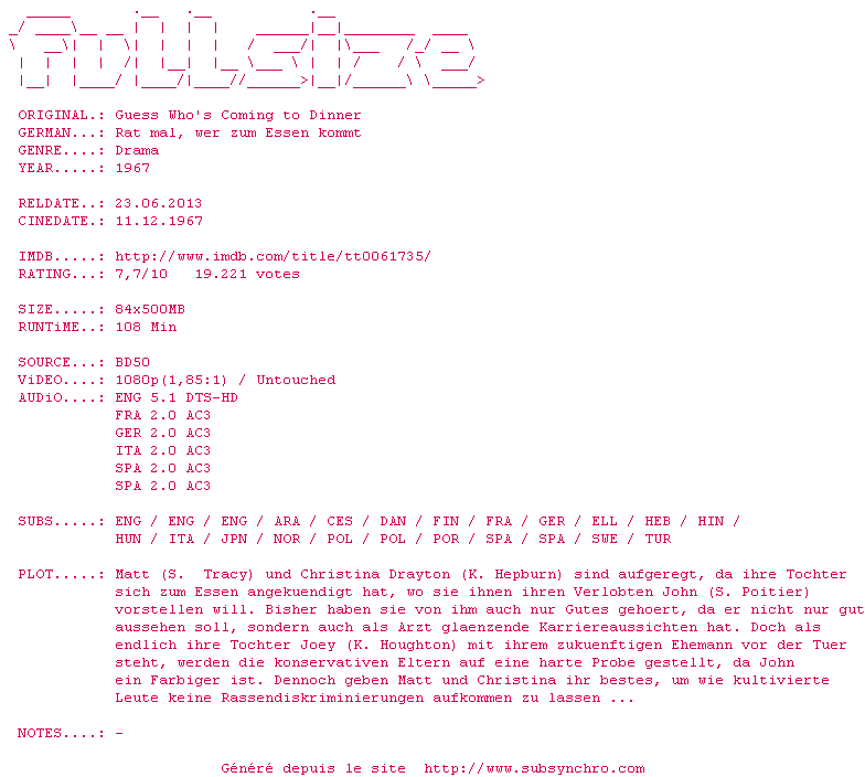 Le commentaire de Yaumegui Commente par Yaumegui (554), Le Samedi 12 Decembre 2015 à 18h13 Un film qui a compté à sa sortie. Malheureusement sans effet, les afro-américains sont toujours la cible des racistes. Sur le plan de la mise en scène, c'est une pièce filmée, les acteurs font le boulot même si Spencer Tracy est très fatigué par son cancer qui l'emportera juste après le tournage. 6.5 / 10 1 0