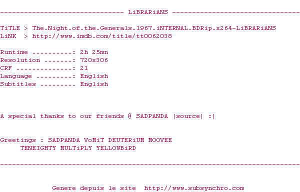 Y avez-vous pense ? Nous proposons déjà 2 sous-titres pour le film La Nuit des généraux. Avez-vous essaye de voir si ces sous-titres etaient compatibles avec cette release ? On vous laisse le soin de tester cela pour nous et de contribuer au site en postant le sous-titre en cas de compatiblite constatee !