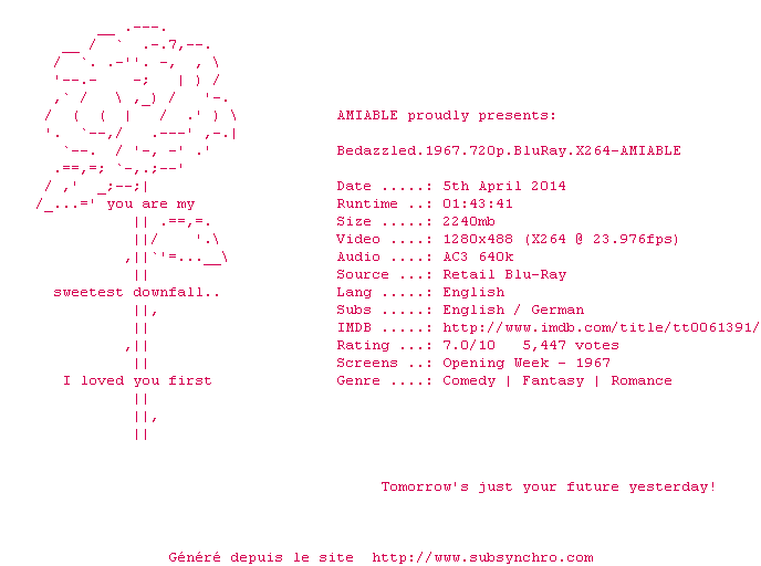 | Voir le nfo de la release Bedazzled.1967.720p.BluRay.X264-AMIABLE | AMIABLE | Bedazzled.1967.720p.BluRay.X264-AMIABLE OpenSubtitles | 0 fichier | ||