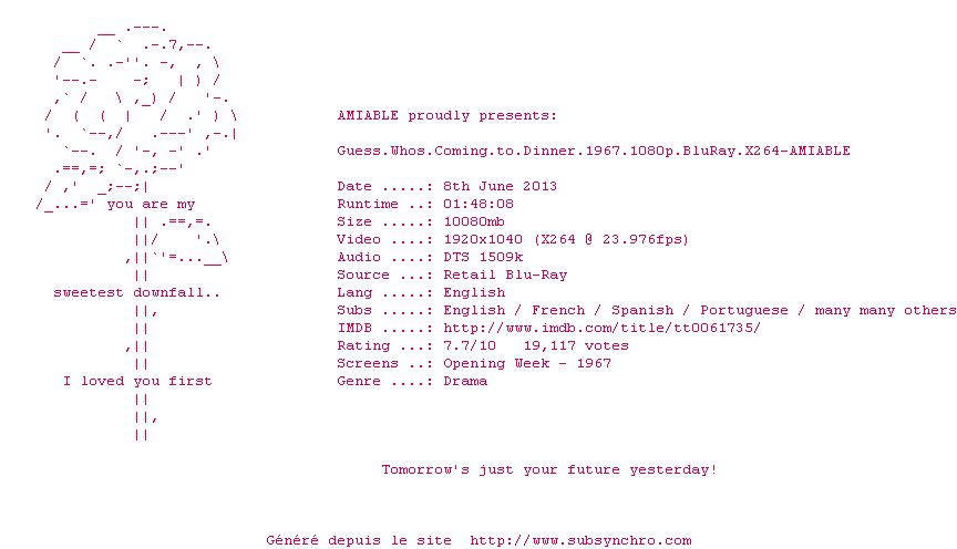 Commentez le fichier Guess.Whos.Coming.to.Dinner.1967.1080p.BluRay.X264-AMIABLE.Fr.srt