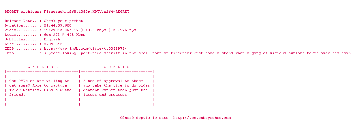 Voir le nfo de la release Firecreek.1968.1080p.HDTV.x264-REGRET