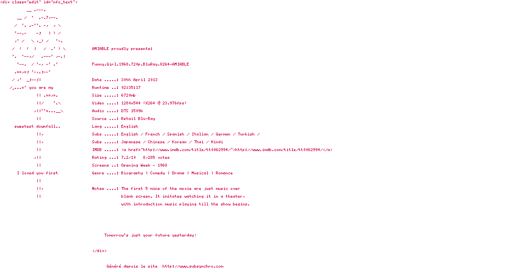 Voir le nfo de la release Funny.Girl.1968.720p.BluRay.X264-AMIABLE
