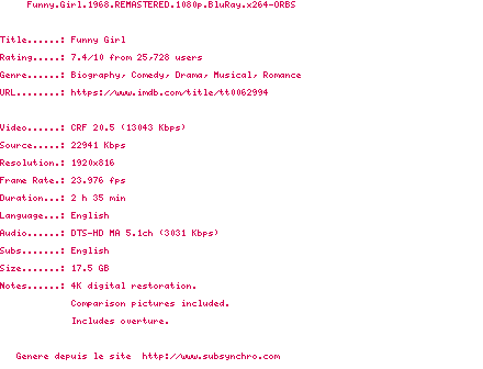 Voir le nfo de la release Funny.Girl.1968.REMASTERED.1080p.BluRay.x264-ORBS
