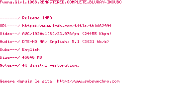 Voir le nfo de la release Funny.Girl.1968.REMASTERED.COMPLETE.BLURAY-INCUBO