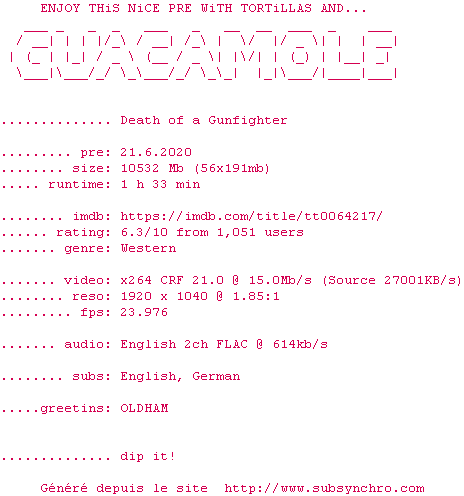 Voir le nfo de la release Death.Of.A.Gunfighter.1969.720p.BluRay.x264-GUACAMOLE