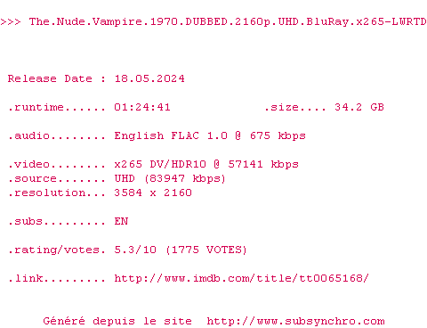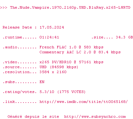 Voir le nfo de la release The.Nude.Vampire.1970.DUBBED.2160p.UHD.BluRay.x265-LWRTD