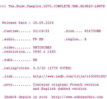 Voir le nfo de la release The.Nude.Vampire.1970.2160p.UHD.BluRay.x265-LWRTD