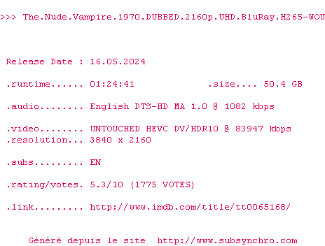 Voir le nfo de la release The.Nude.Vampire.1970.2160p.UHD.BluRay.H265-WOU