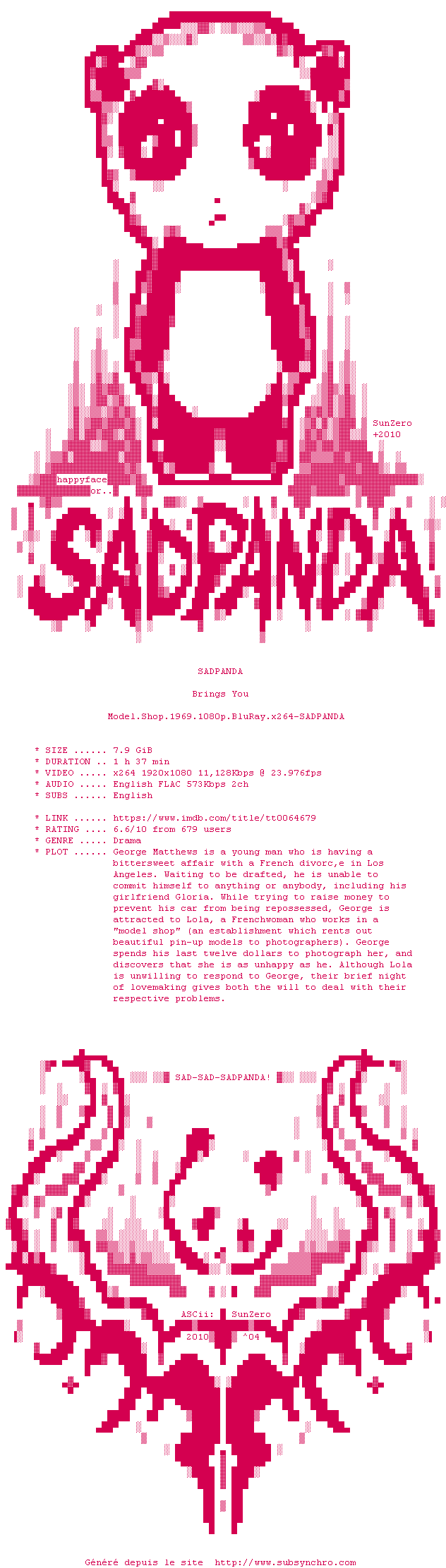 | Voir le nfo de la release Model.Shop.1969.1080p.BluRay.x264-SADPANDA | SADPANDA | Model.Shop.1969.1080p.BluRay.x264-SADPANDA OpenSubtitles | 0 fichier | ||