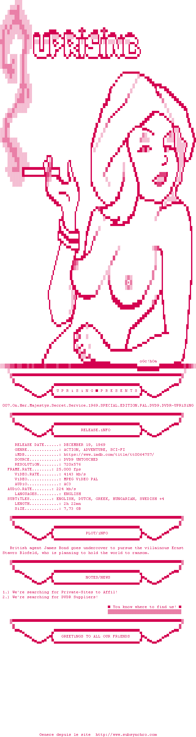 Y avez-vous pense ? Nous proposons déjà 5 sous-titres pour le film Au service secret de sa Majesté. Avez-vous essaye de voir si ces sous-titres etaient compatibles avec cette release ? On vous laisse le soin de tester cela pour nous et de contribuer au site en postant le sous-titre en cas de compatiblite constatee !