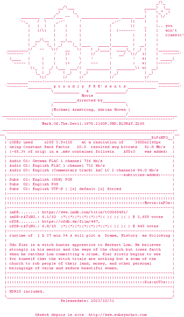Voir le nfo de la release Mark.Of.The.Devil.1970.2160P.UHD.BLURAY.H265-UNDERTAKERS