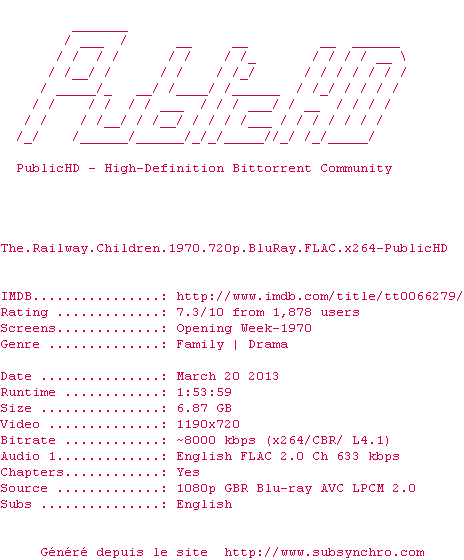 Voir le nfo de la release The.Railway.Children.1970.720p.BluRay.FLAC.x264-PublicHD