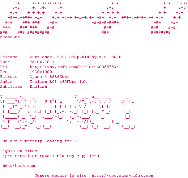 | HD4U | Sunflower.1970.720p.Bluray.x264-HD4U OpenSubtitles | 0 fichier | |||