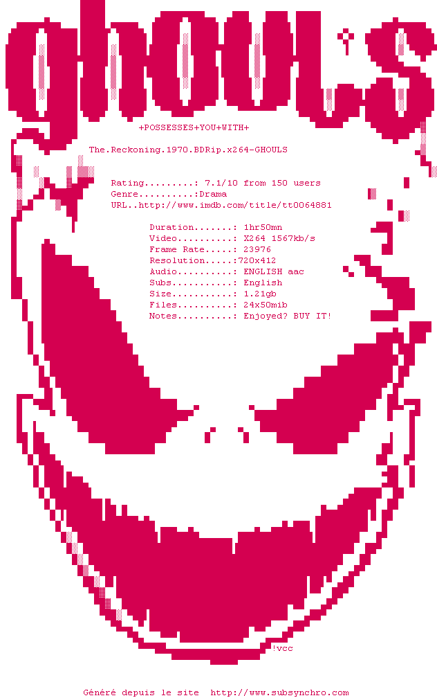 Voir le nfo de la release The.Reckoning.1970.BDRip.x264-GHOULS